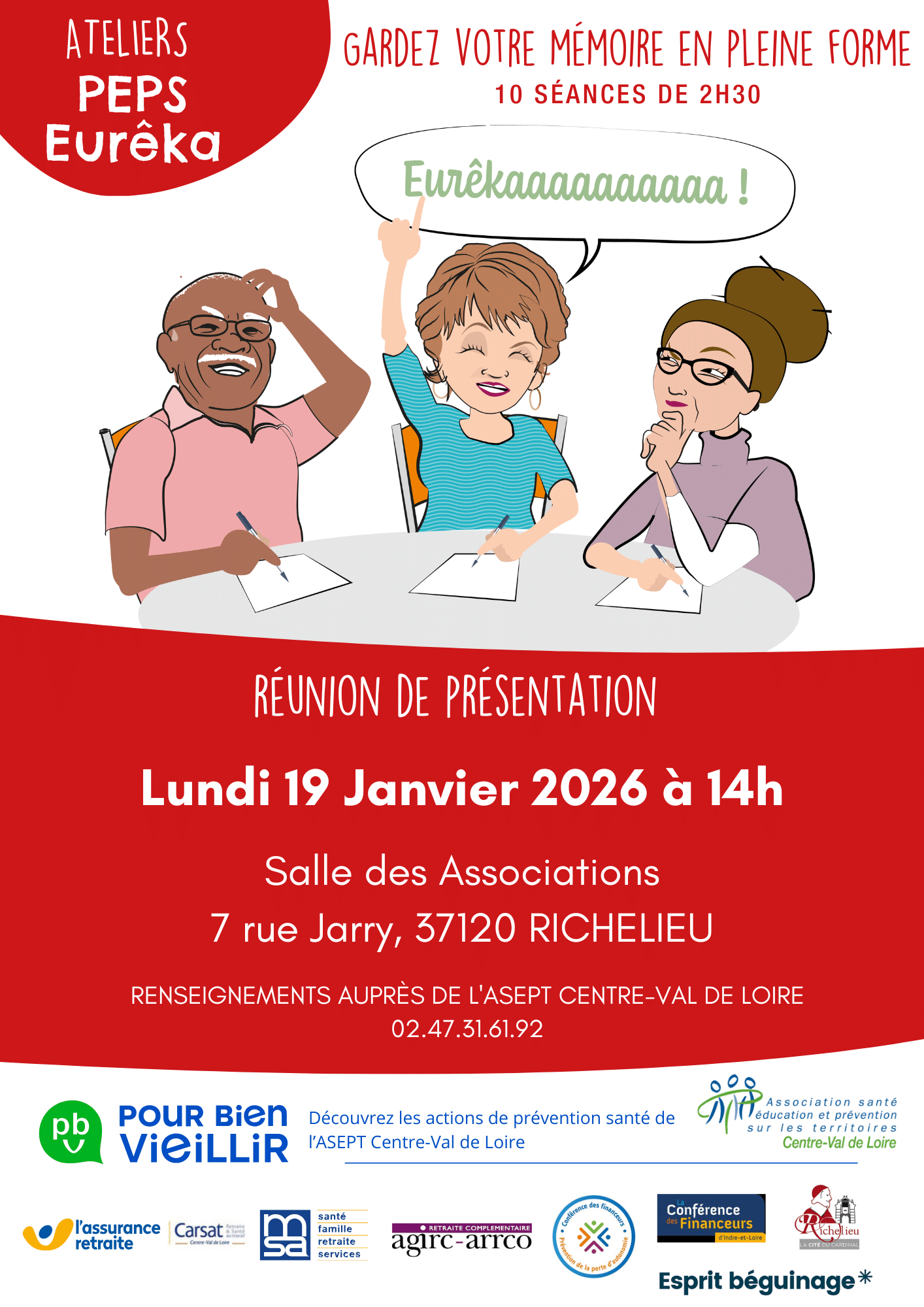 Vous pourrez vous inscrire aux Ateliers Mémoire PEPS Eurêka© à l’issu de cette rencontre auprès de l’animatrice.